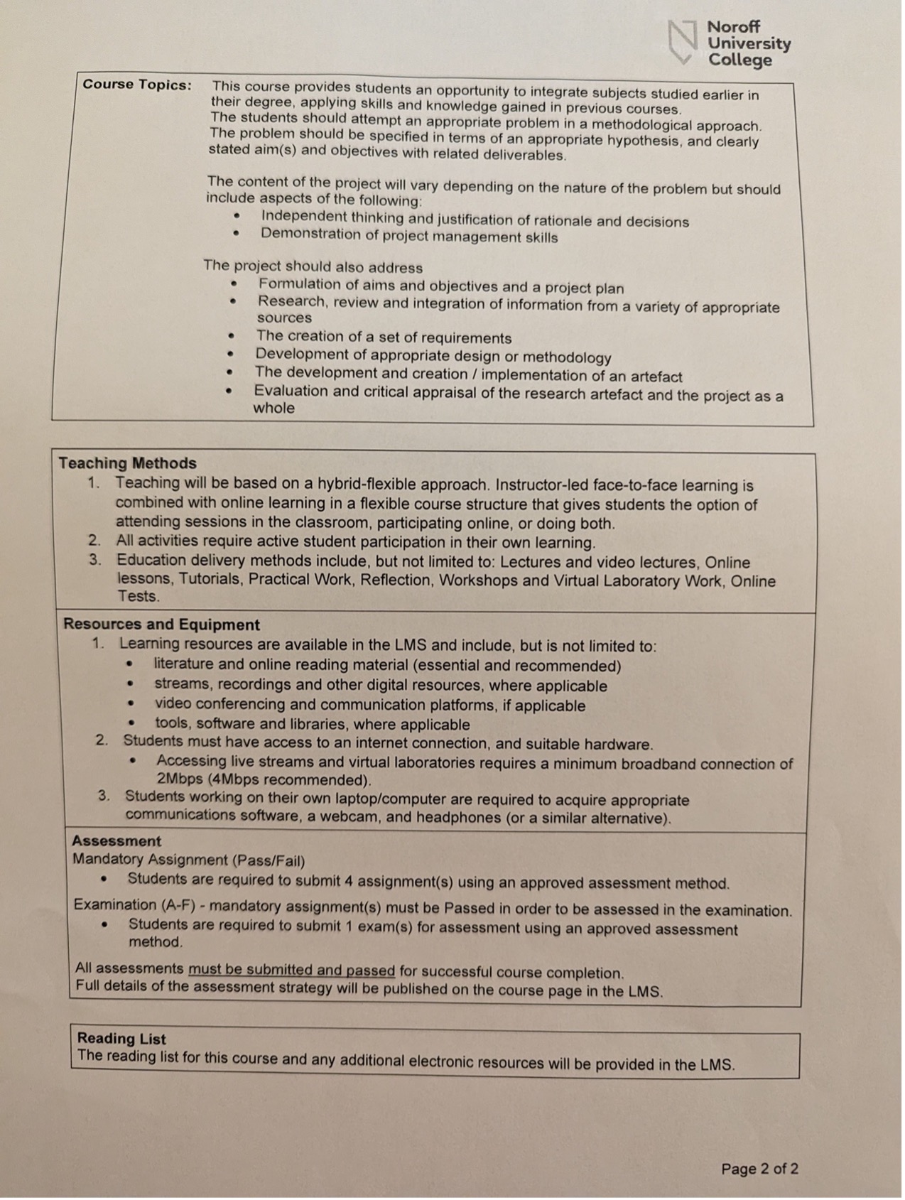 On the second page, under "Course Topics", the Course Description provides the key components of what will be acceptable evidence in the assessment phase, in the form of a project with some requirements and demands for what is acceptable evidence. The form of the assessment is not defined beyond the demand that students will "attempt an appropriate problem in a methodological approach". Further, the project must have a hypothesis and clear objectives and relevant deliverables.