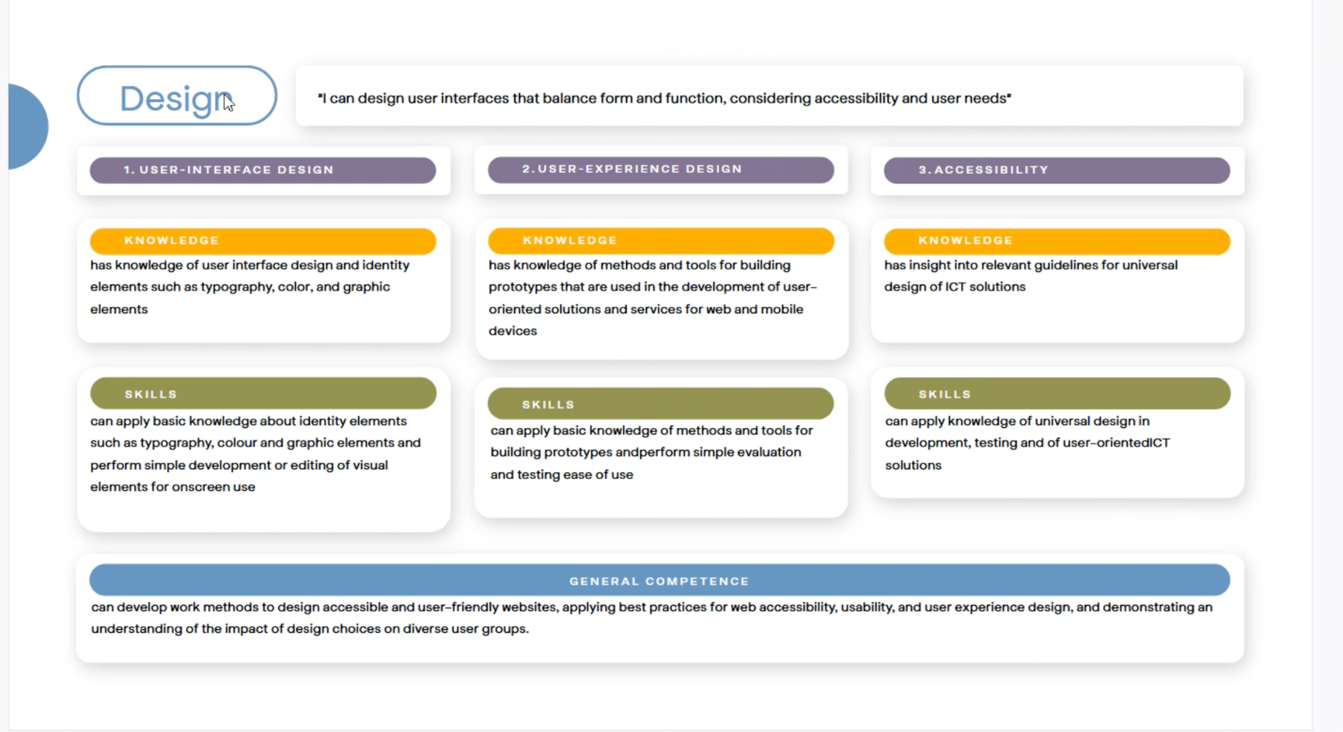 Therefore, my mentor proposes the model in the above diagram, where each Outcome, as listed in the study plan, is made up of knowledge and a skill. In the provided diagram there are three areas of knowledge and skills that come together to produce the final general competence outcome. The entire outcome is defined by the initial statement of what the student can do by the end of the unit/lesson/module. In this case, that is "I can design user interfaces that balance form and function, considering accessibility and user needs".